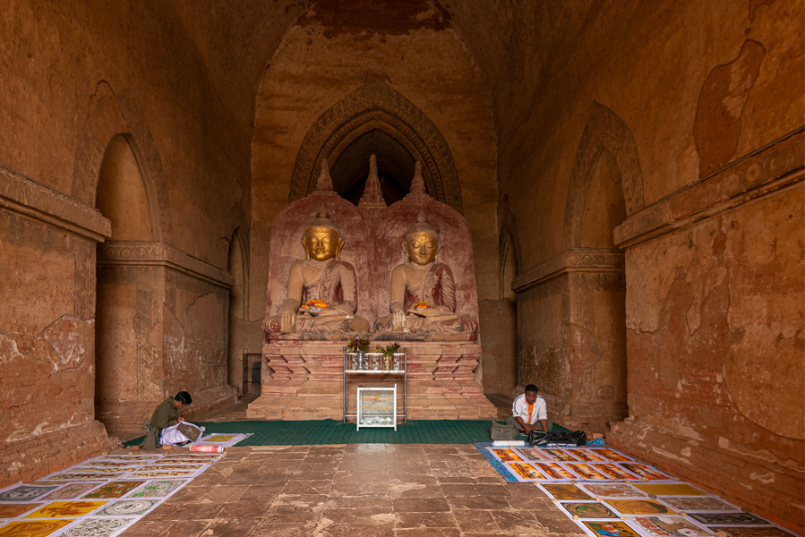 进到最大的佛塔达玛扬基塔即”大妈养鸡“塔里面去逛,里面高高的空间,一圈宽大的回廊,阴天光照不强显得阴森森的。这座塔的故事由珠珠给我们娓娓道来,修建这座塔的国王是个暴君,他杀父弑兄夺取王位,而后又想用修佛塔来积功德赎罪,暴君对建塔工程要求严苛,工匠出错便受罚被剁手,佛塔的设计师知道下场不妙,就千方百计拖延时间。这座塔以“双佛塔”著名,内部供奉两尊并列佛像:释迦牟尼和弥勒,暴君国王想用此寓意父子,为自己开脱。双佛像的背后还友一尊卧佛,典故不知。可谓恶有恶报,塔顶还没建完,暴君就被仇家暗杀。世上的事情往往就这么蹊跷,暴君严厉监视下修建起来的塔异常结实,1975年大地震,蒲甘有近900多座佛塔坍塌,而“大妈养鸡”塔巍峨屹立,没什么损伤。
