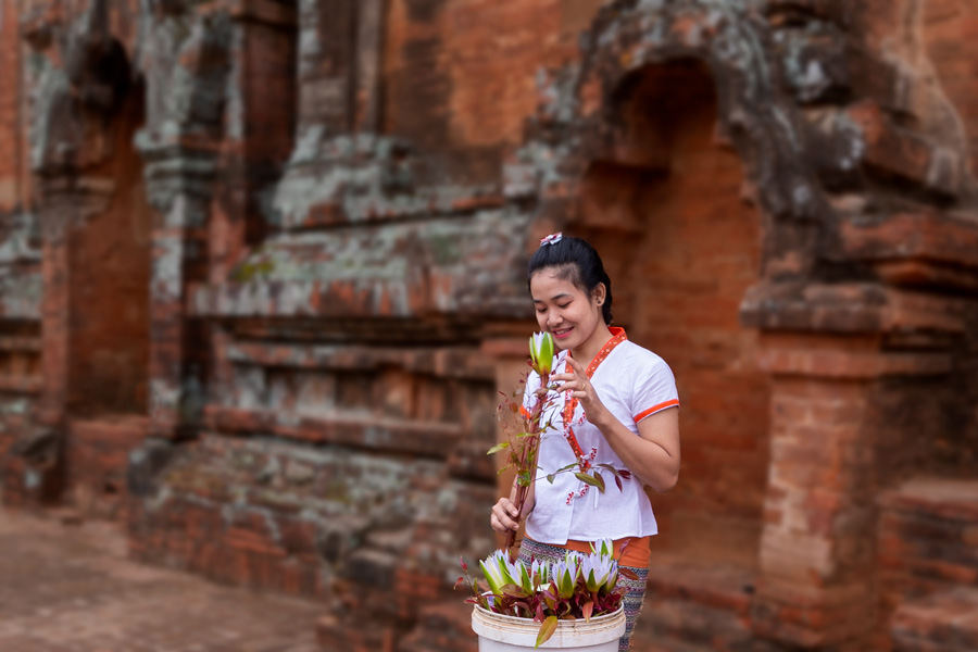 “大妈养鸡”塔前准备的买花献佛的姑娘。