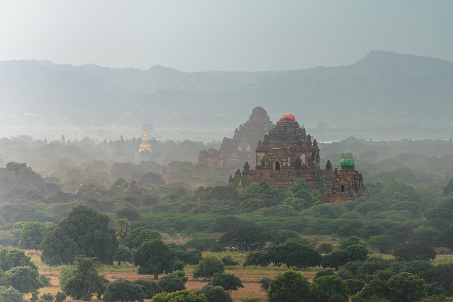 气球与著名的几座佛塔同框:金色玉米棒子形状的是阿南达寺(Ananda Pahto);左边高大的是棱角分明,造型朴实庄重的达宾纽寺(Thatbyinnyu Pahto );中间靠近阿南达寺的是马哈波蒂佛塔(Mahabodi Pagoda)。