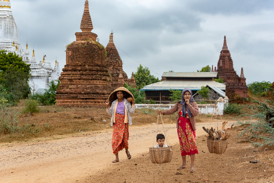 下午4点过到达蒲甘,眼见广袤无际的荒原,丛林中隐现众多佛塔,甚是壮观。小白老师先带我们去寻找暮归的牛羊群,阳光西斜,光线正好,还有佛塔做背景。缅甸的牛,瘦骨伶仃,颜色都是白色的,跟赭红色的古旧佛塔绝配。牧牛女瘦得像柴火棍,她们身手敏捷,赶着白牛往家走。两个牧牛女怎么控制一大群牛呢?她们除了用鞭子,还用弹弓!只要看见调皮的牛有脱群的倾向,她们用弹弓收拾它,让它乖乖归队。我们在牛群中找视角,请求牧牛女摆姿势,人家不仅不恼,还微笑配合。