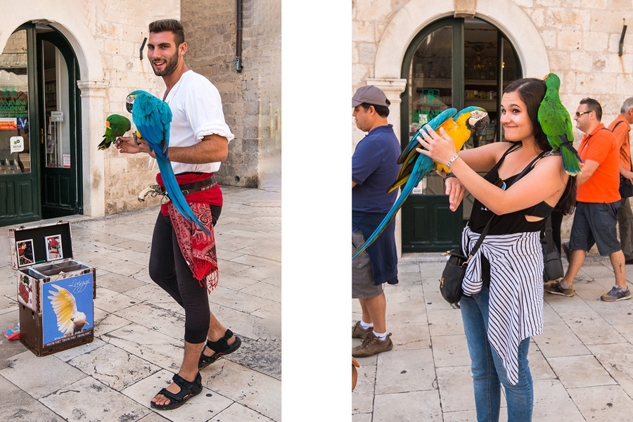 这位当地人将训养的鹦鹉放在游客头上肩上收钱拍照,我很想听听鹦鹉学舌,但它们久久沉默不语。