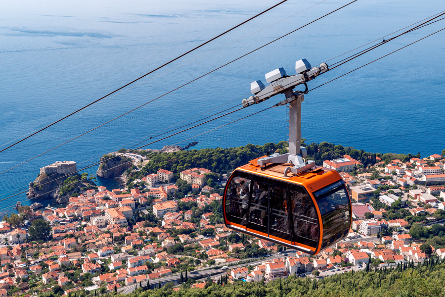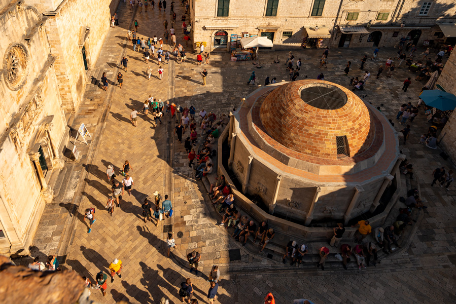 游老城有高空、中空和地面三重视角:1)乘缆车上山到Mt Srd山顶从高空俯瞰;2)在城墙上围绕老城走一圈近观;3)地面游览从西面佩利城门(Pile Gate)内的喷泉池出发,漫步城中大道,一头是斯特拉顿广场(Placa Stradun),另一头是斯蓬萨宫(Sponza Palace)。