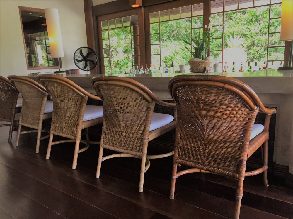 换个角度再拍一张,竹藤座椅,实木大床,躺着就能欣赏大片落地窗外的景色。