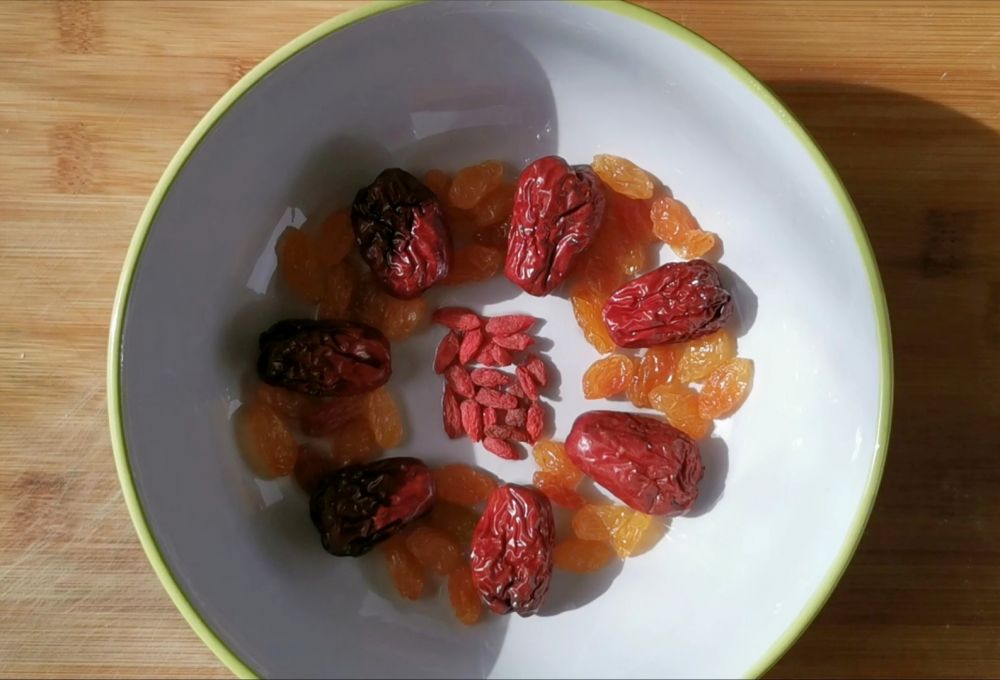 二、圆底容器刷食用油,将红枣和葡萄干、枸杞铺在碗底
