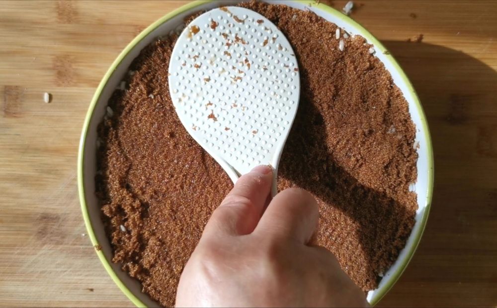 在铺上糯米和红糖压实