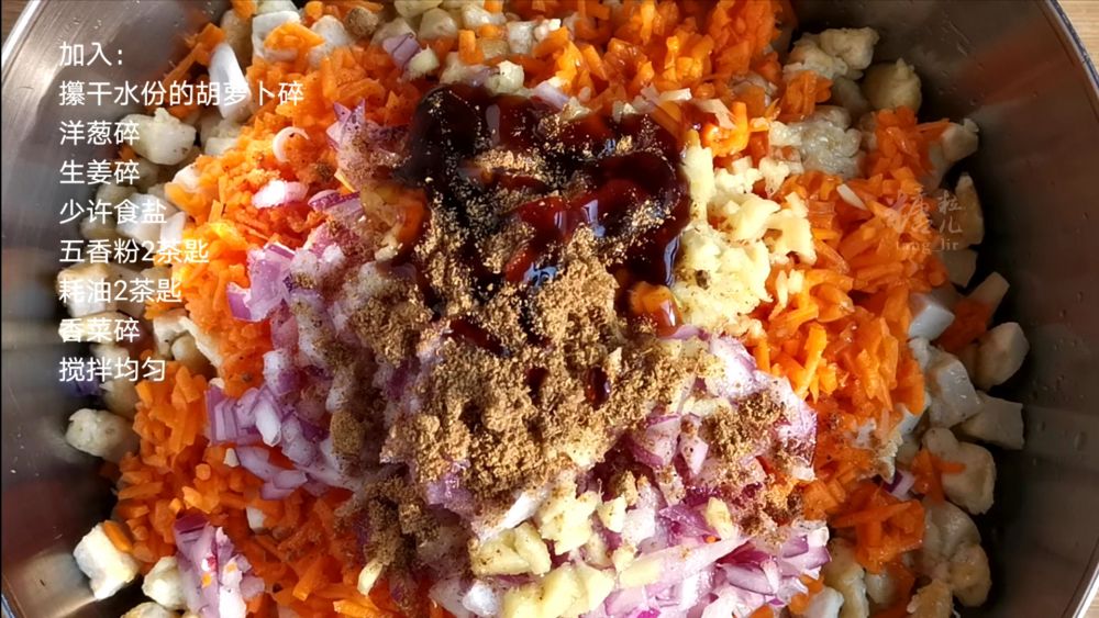 二、豆腐、大白菜、胡萝卜切成小颗粒,加入洋葱碎、姜碎,调味料搅拌均匀