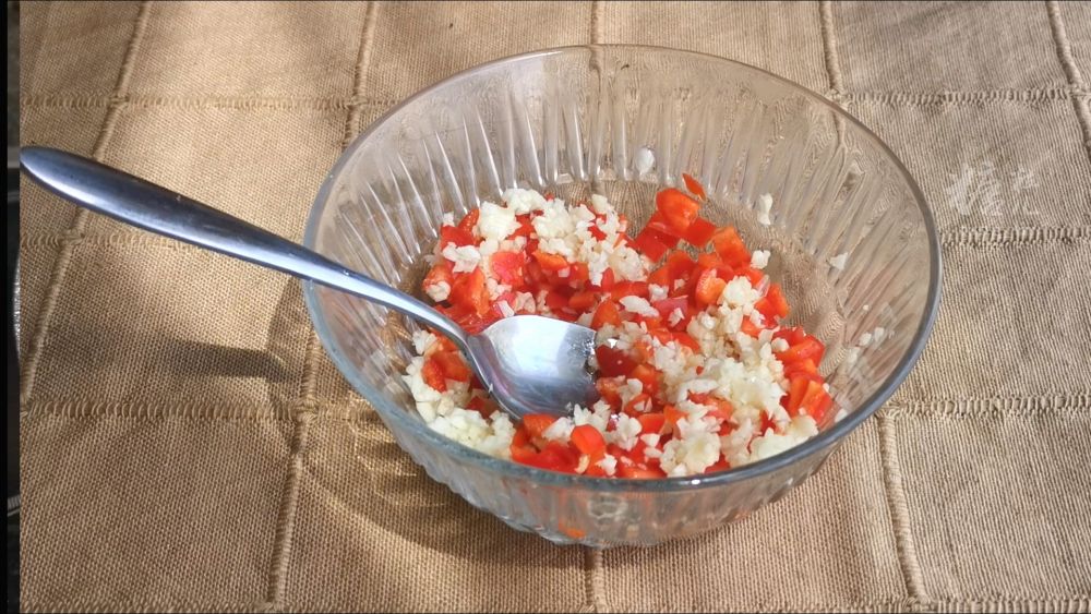 大蒜3~4瓣,小米椒1~2个,白糖1/2茶匙,食盐少许,生抽1茶匙,香醋1茶匙,香油1茶匙,鸡精几粒