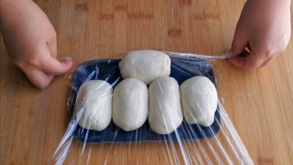一,温水和面,将和好的面团分成五等份,表面刷油覆盖保鲜膜,饧面半小时以上