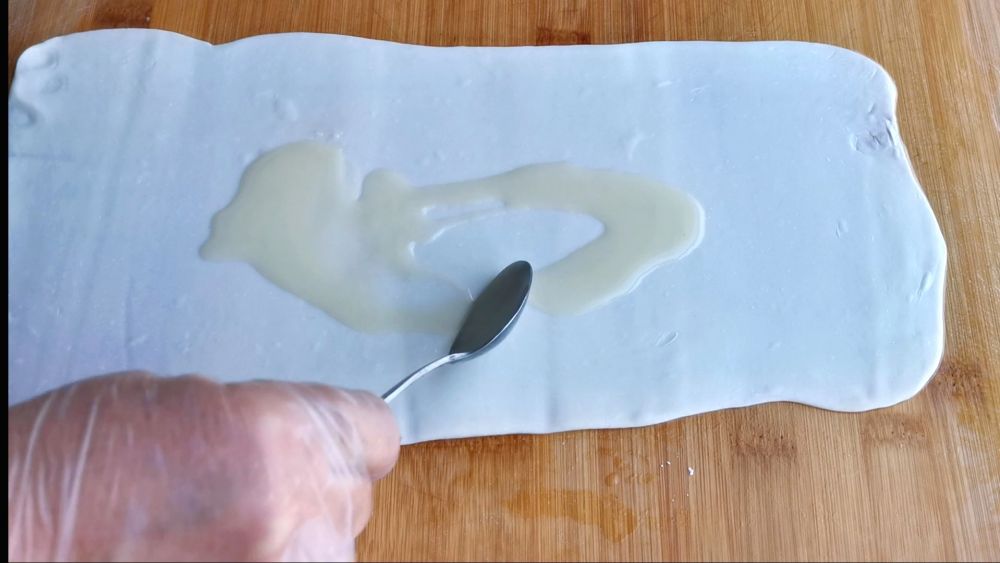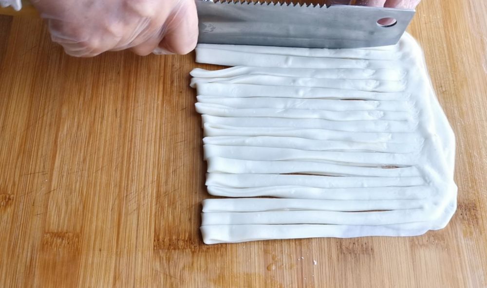 三、取出饧好的面团擀成长方形薄片,刷上稀油酥对折切细条