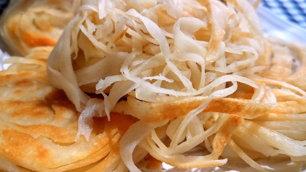 千丝万缕的盘丝饼,柔软好吃凉了也不会硬,无需任何添加剂,切一切卷一卷,好做又好吃,香到好吃不离口!在配上一盘爽口小菜,来碗绿豆粥,就是一顿夏天的美味晚餐。