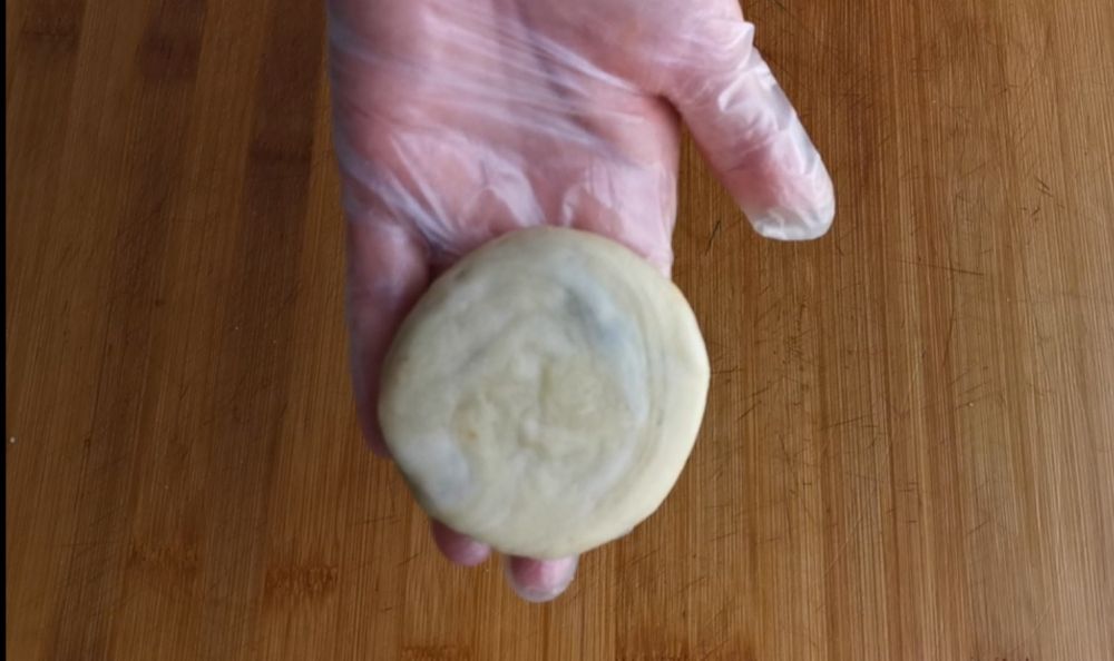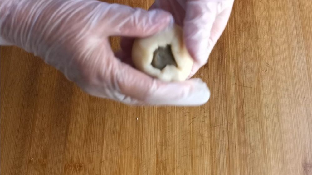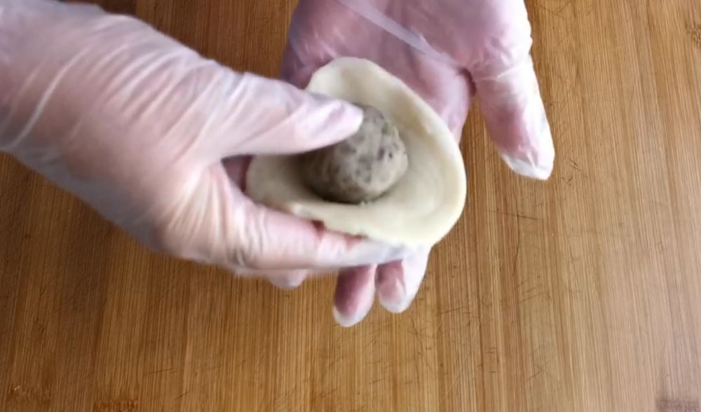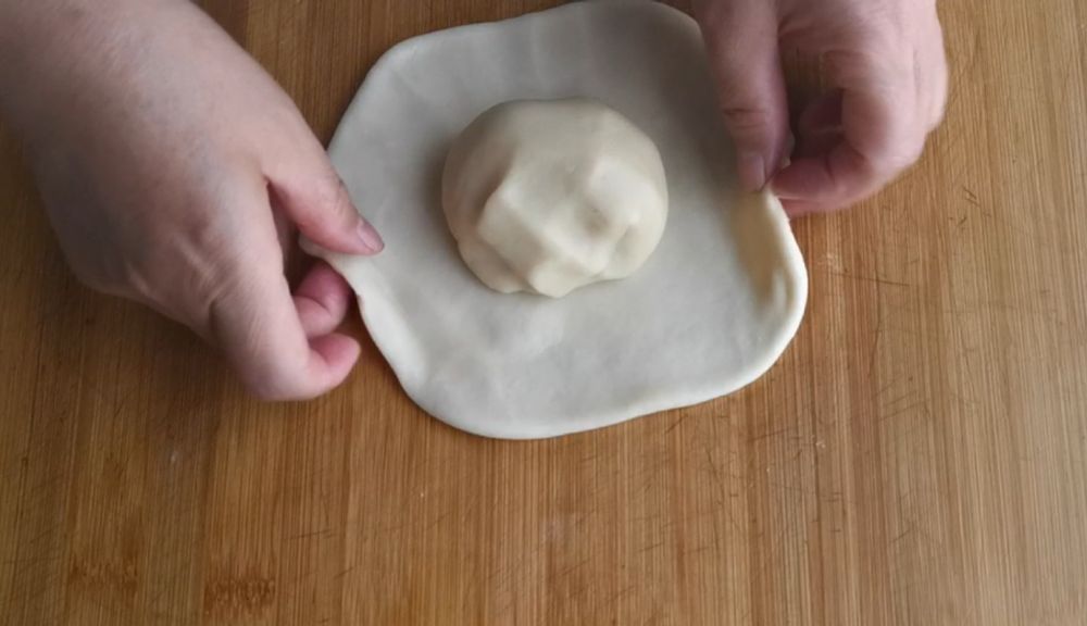 每只小面剂像擀饺子皮那样擀开,包入一粒绿豆沙球,将口更严重,压成小饼胚。
