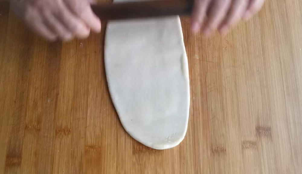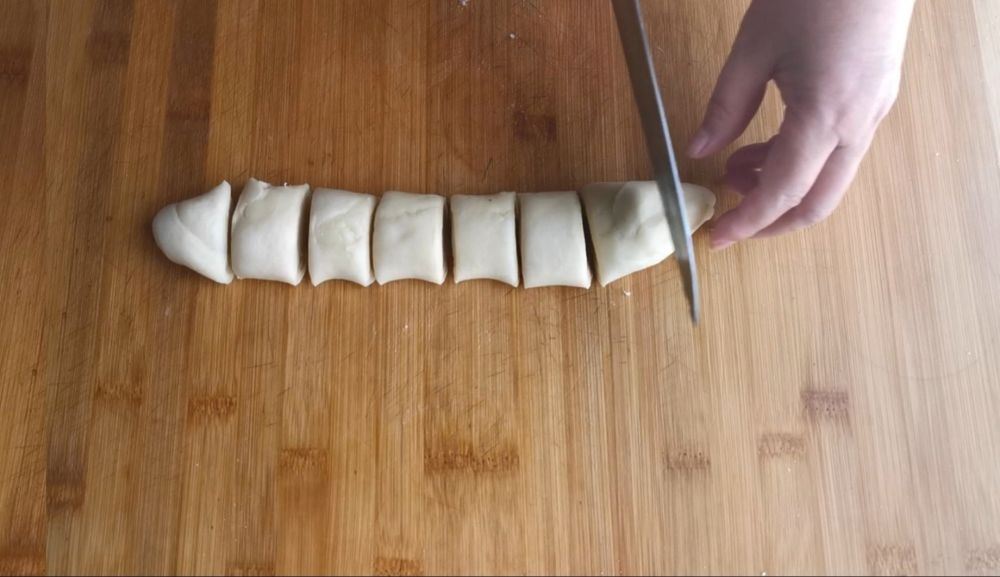 先用大包酥方法用水油皮包裹油酥面团折叠擀开,分成均等小面剂,每只35克。