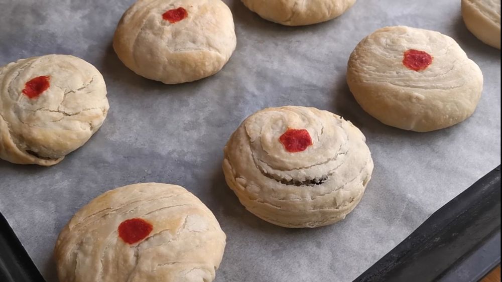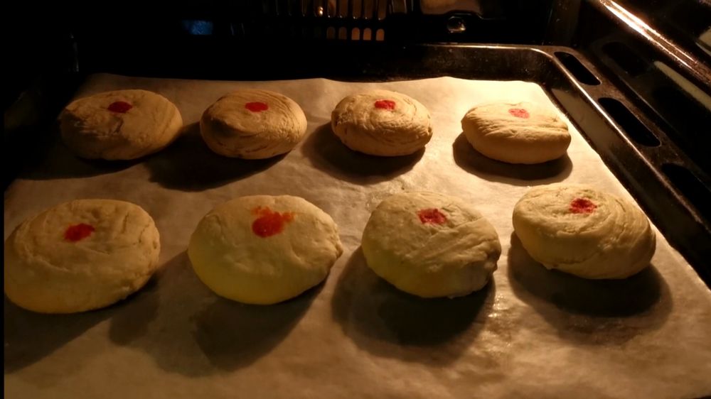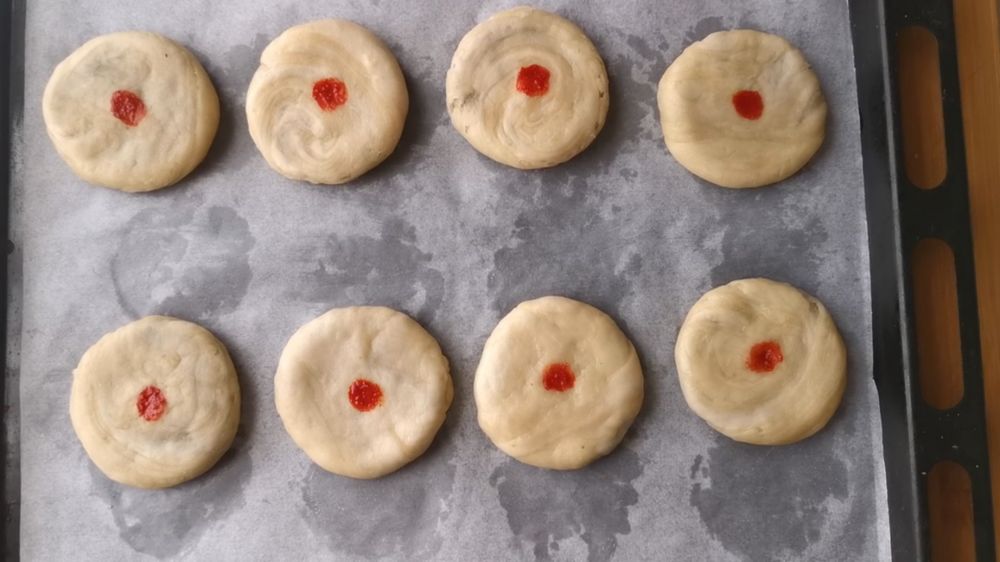 所用小饼胚做好后,用红曲粉或食用红色素点上红点做装饰。