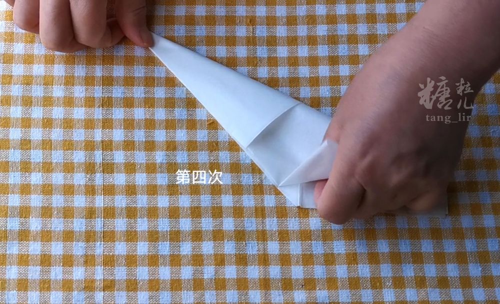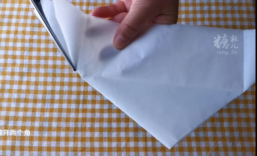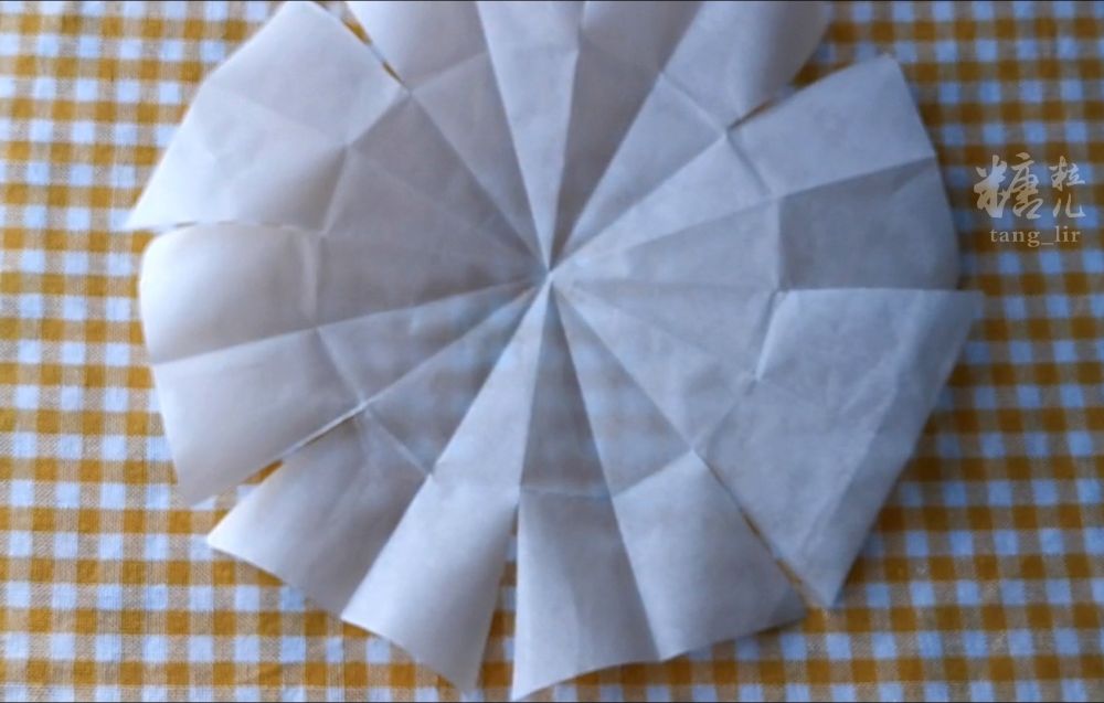 准备正方形烘焙纸一张,对角折叠两次,两剪刀搞定。