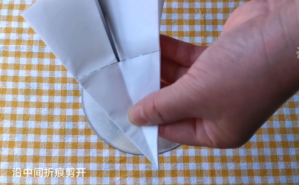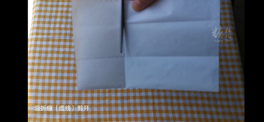 准备长方形烘焙纸一张,对边折两次,沿折痕剪两刀搞定。