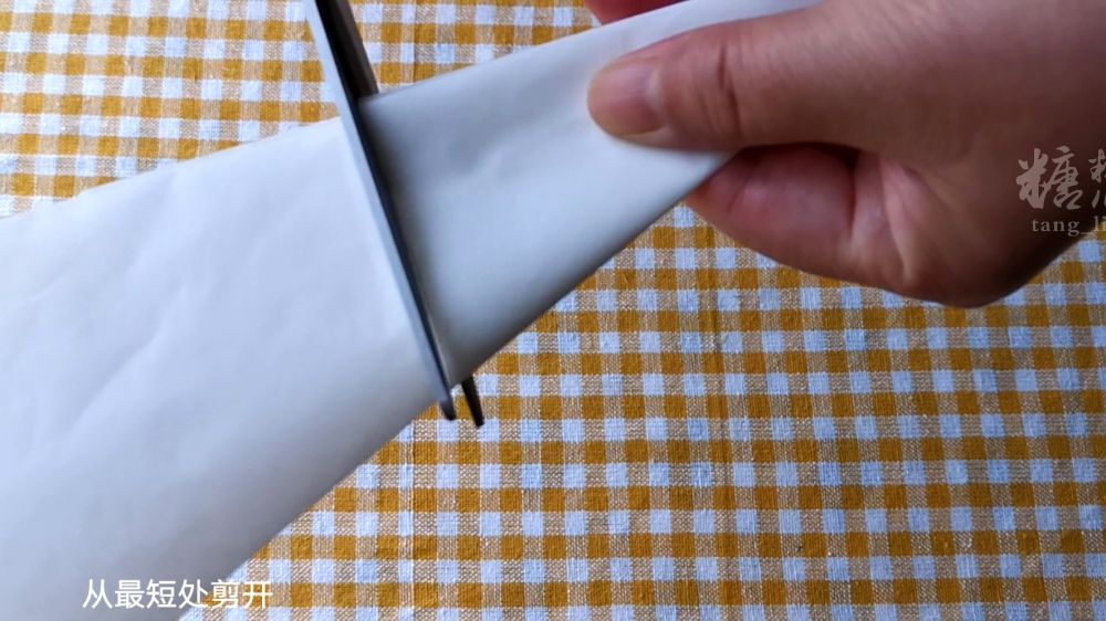准备正方形或者长方形烘焙纸一张,对角折四次,先剪一刀,