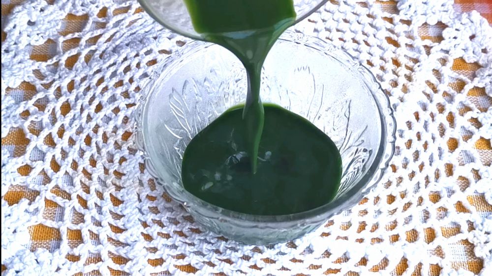 一、新鲜班兰叶洗净剪成小段,放入果汁机加入两倍清水,打成细腻糊状