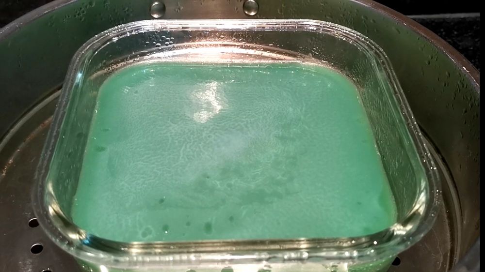 二、玻璃容器刷薄油防沾,分别倒入两种颜色淀粉糊,每层蒸制4~5分钟