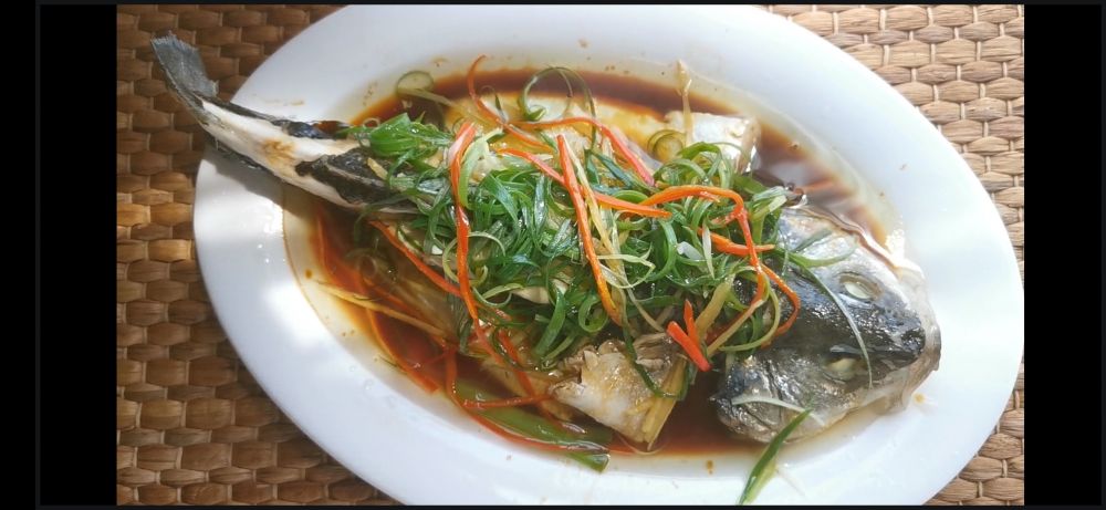 三、几片生姜摆在鱼身上,滚水上锅,根据鱼的大小,大火蒸7~8分钟,放松准备好的三丝,用热油炝香