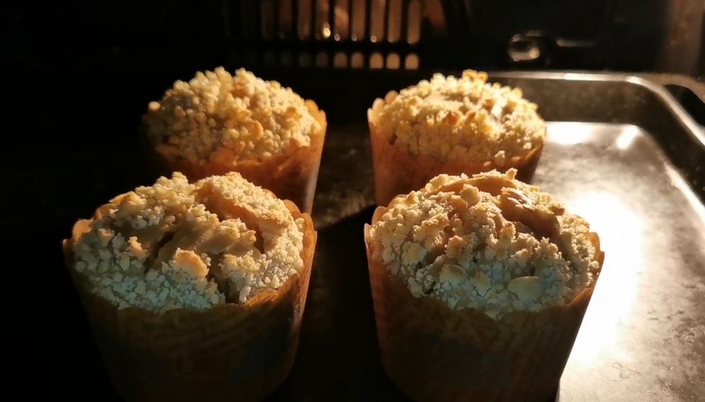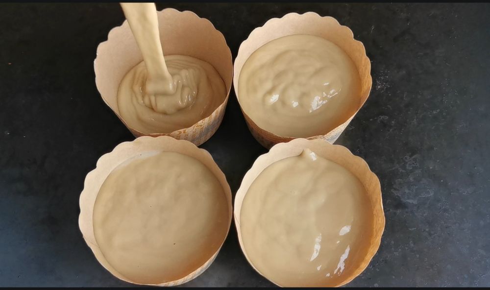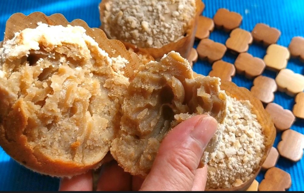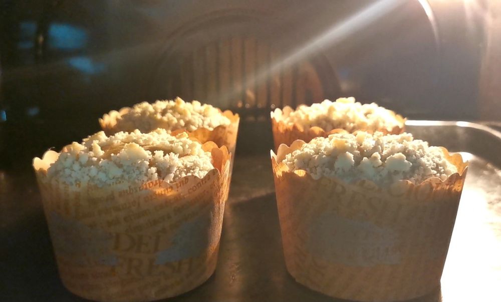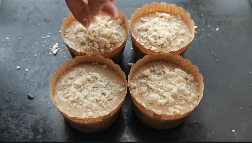二、将混合好的面糊倒入纸杯中,轻微震荡排气,表面撒上香酥粒,并提前180摄氏度预热烤箱,十分钟