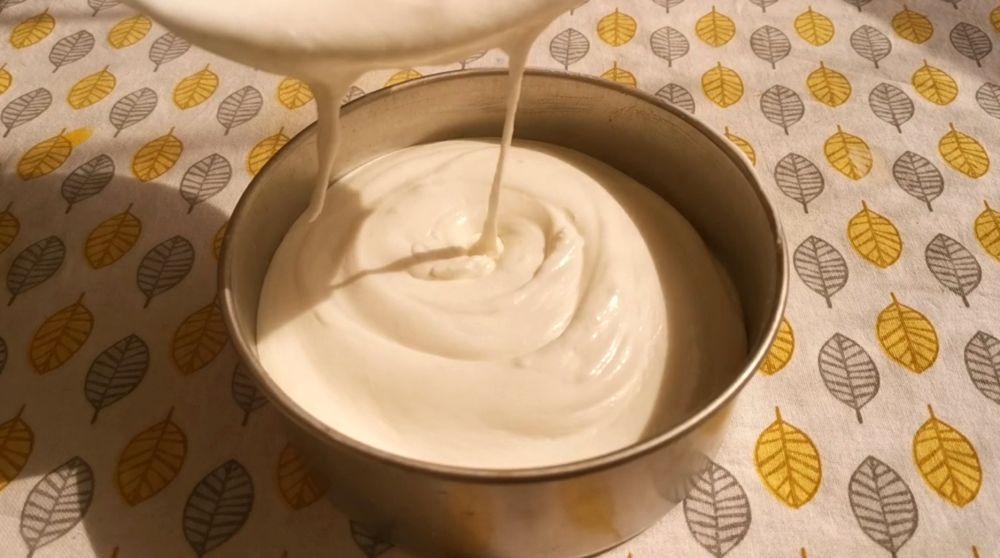 三、将混合均匀奶油奶酪糊倒入底部铺了烘焙纸的6存圆形模具中,覆盖后放入冰箱冷藏4~5小时