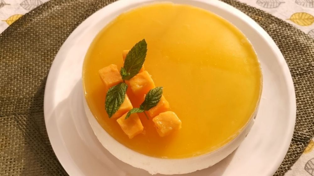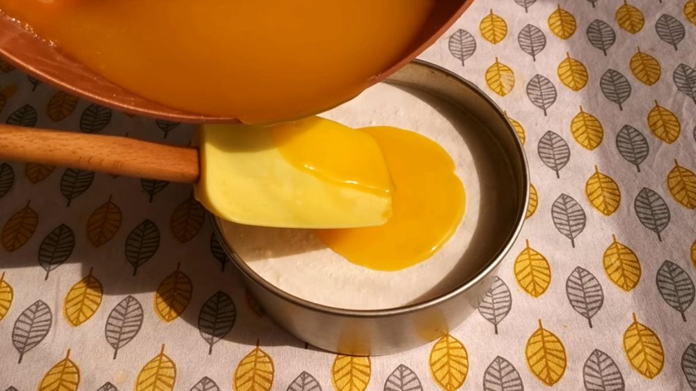 四、将100克浓稠芒果汁倒入剩余的30毫升燕菜胶中煮开,倒入冷藏过的蛋糕表面,继续覆盖放入冰箱冷藏区1小时左右,直到芒果冻凝固,取出脱模,顶部稍加装饰,切块即食