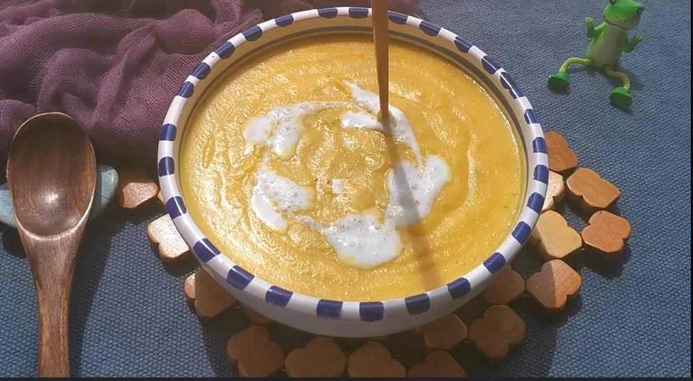 二、煮滚南瓜糊,加入处理过的面粉泥混合煮沸,点上奶油少许做装饰,撒上南瓜籽即食