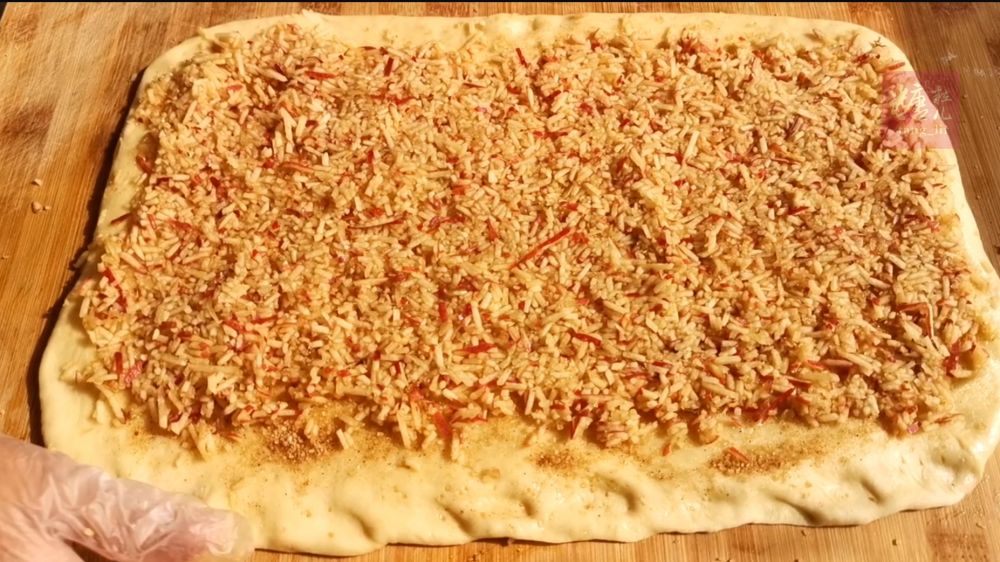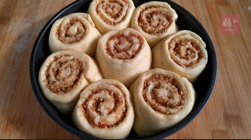 三、饧发好的面团擀成约38x25cm的长片,抹一点油,撒上棕糖肉桂粉和铺满苹果粒,卷起来切成八等份,摆入烤盘中(我用的烤盘尺寸是:21cm直径x4cm高度),并覆盖二次饧发至两倍大小