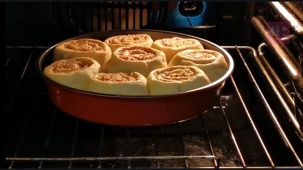 四、烤箱提前180摄氏度预热,将烤盘放入中层上下火180摄氏度先烤十分钟,刷上全蛋液,覆盖锡纸继续烤十分钟,然后去掉锡纸,烤到表面金黄色