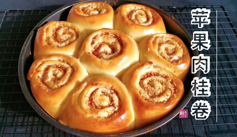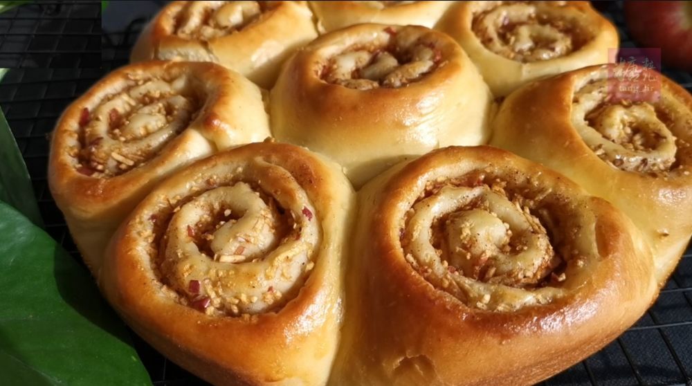 金灿灿松软好吃的苹果肉桂卷出炉了,满室弥漫着苹果肉桂香