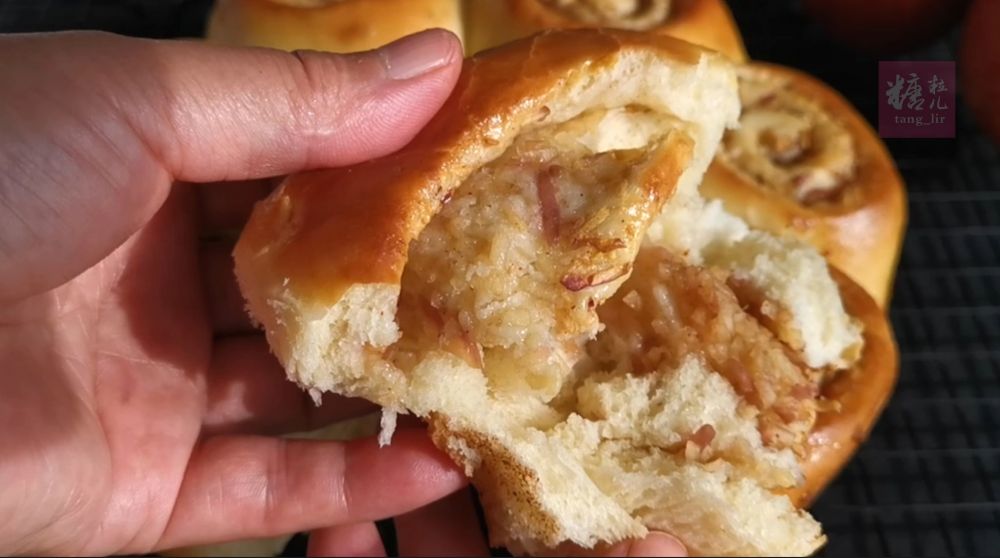 苹果和肉桂搭配是我最喜欢的甜点配料之一。今天做了这个【苹果????肉桂卷】,松软中透着浓郁的苹果肉桂香,刚出炉一半就吃光了,真的很好吃!我用了和面时直接加入软化黄油的方法,使面团和起来轻松不粘手,而且不需要揉出手套膜,做出的面包卷照样即蓬松又拉丝,我把它分享给朋友们。