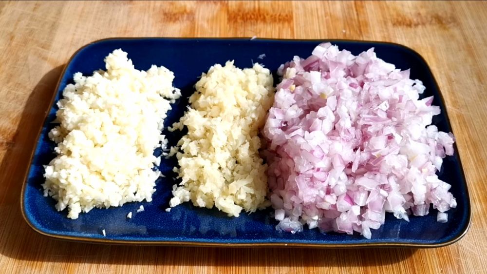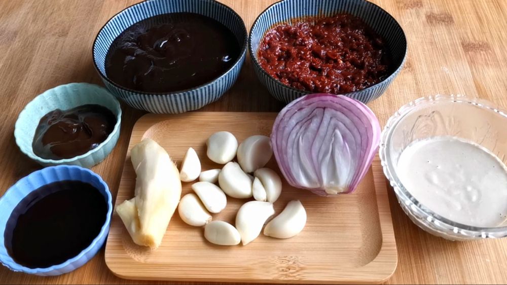 洋葱、生姜、大蒜切碎,豆瓣酱切碎,各种酱料按配方准备好,容器洗净控干水份