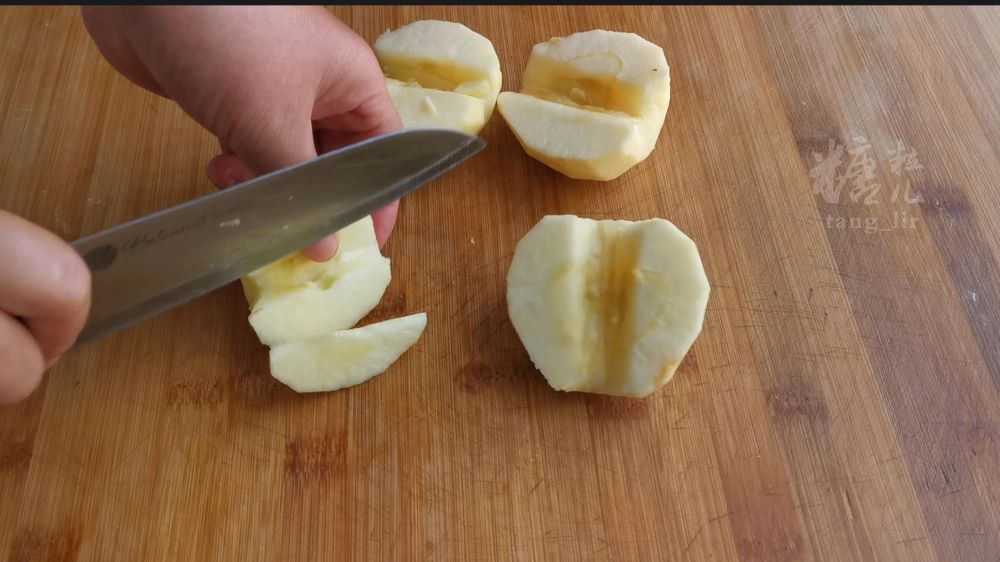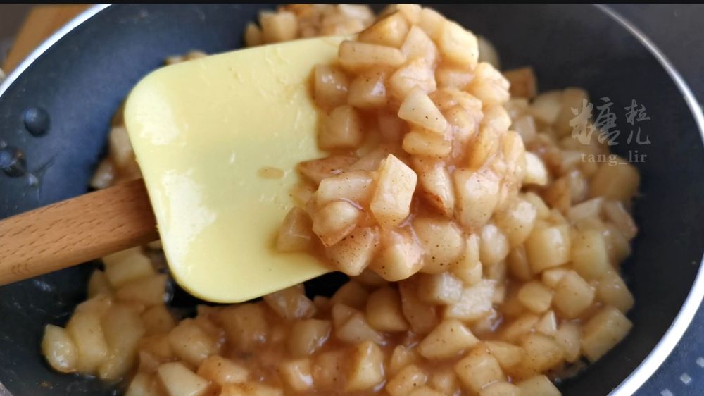二、苹果去皮去核切成小颗粒,加白糖、肉桂粉等炒到微微变软,自然冷却备用