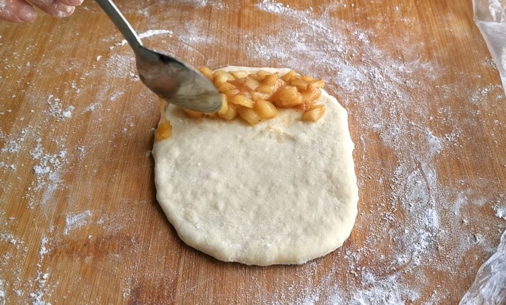 三、小面剂擀成椭圆形,包入苹果馅料做成下图中的六个面包胚,覆盖二次饧发到明显膨胀,表面刷蛋液并撒上黑芝麻