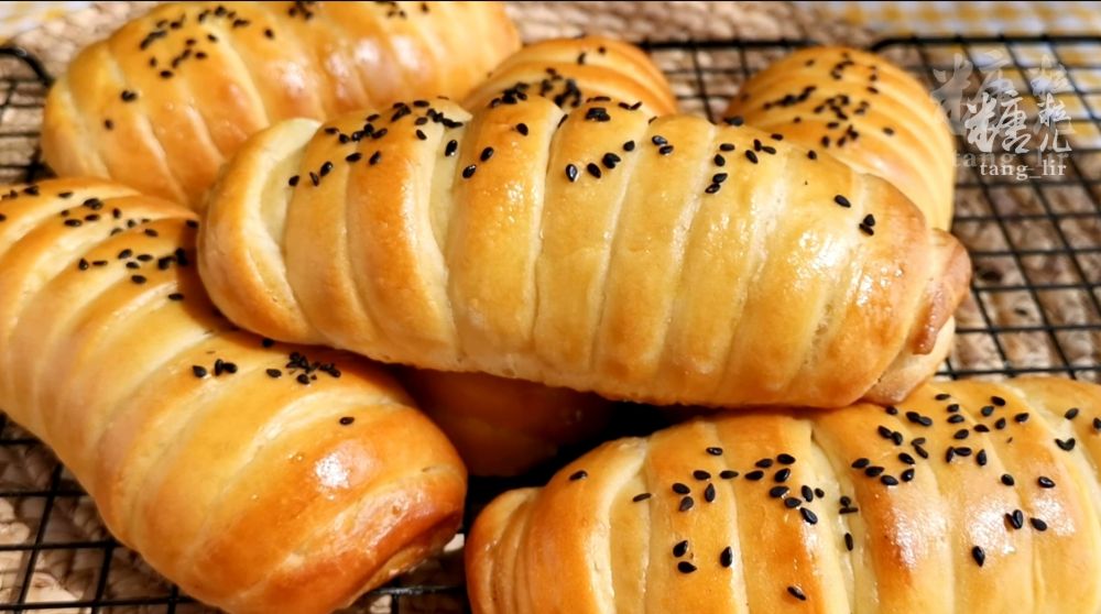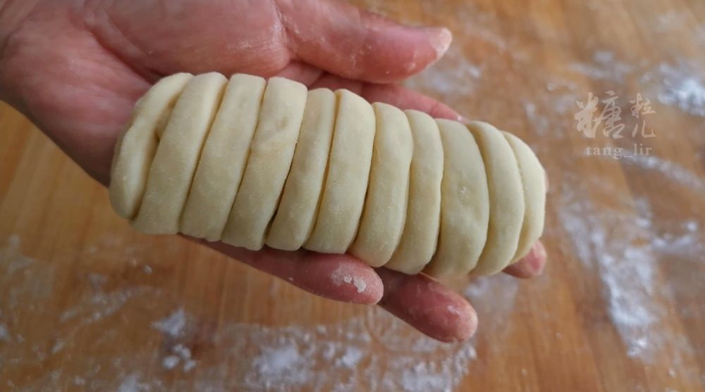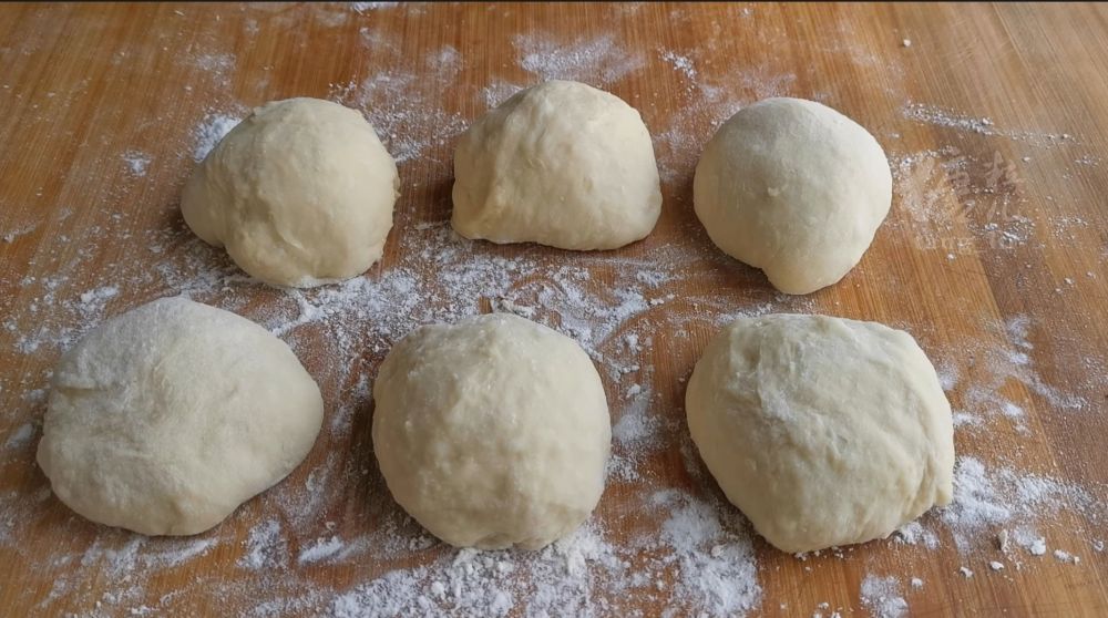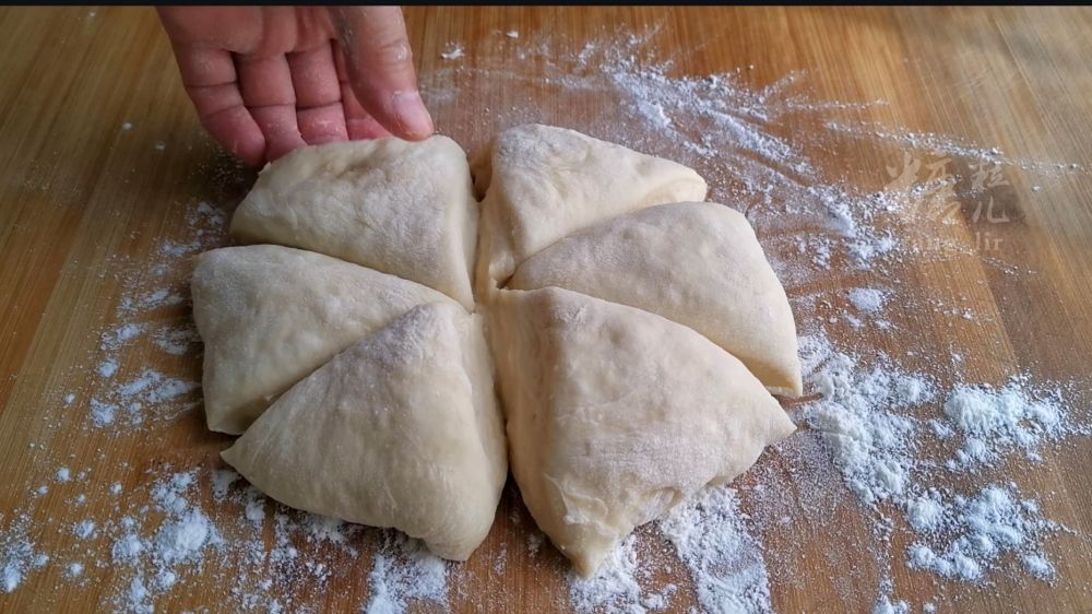 一、以上原料混合家,搅拌成一个软面团,覆盖饧发至两倍大小,分成六个均等面剂