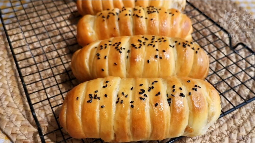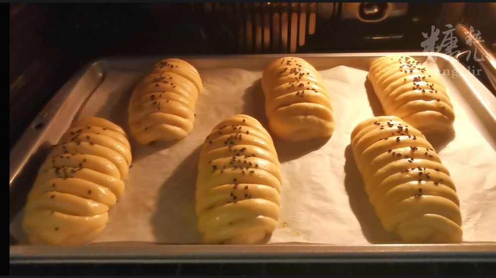 四、放入提前预热好的烤箱,上下火,中层160摄氏度,烤20到25分钟,直到表面金黄色