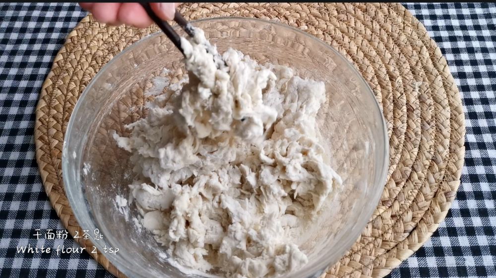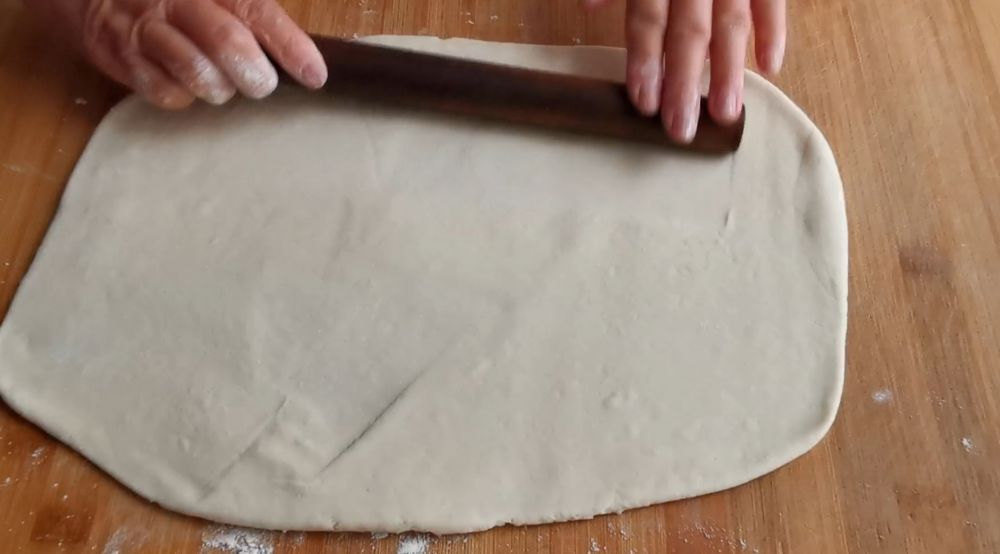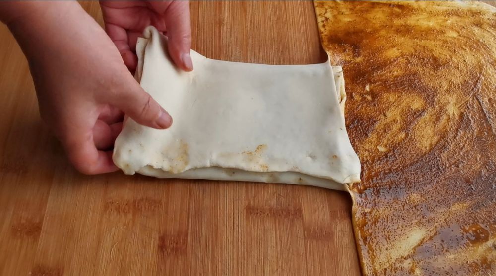 一、以上原料用温水和成偏软面团,松弛一下取出简单搓揉,擀成长方形,抹上烧烤味油酥,折叠后擀成正方形,覆盖饧发30分钟