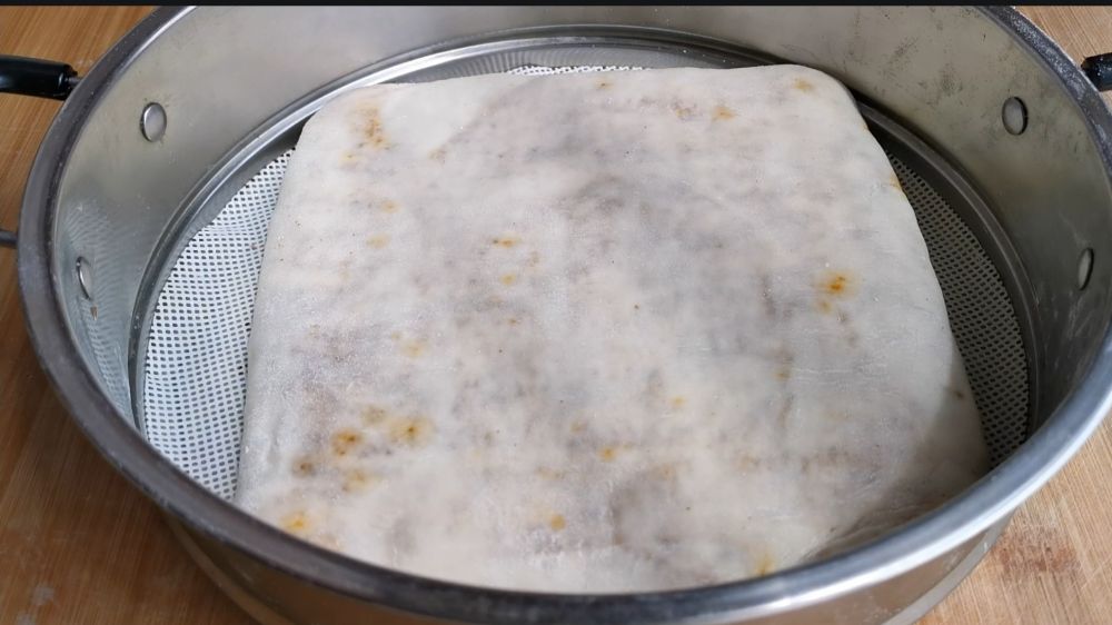 二、大火蒸20分钟,焖三分钟出锅,平底锅刷一点油将两面烙至酥脆金黄,切块即食