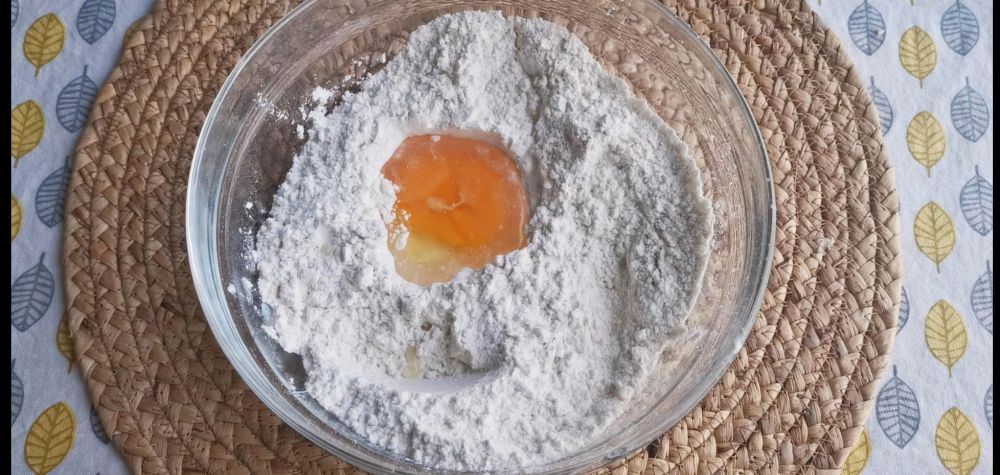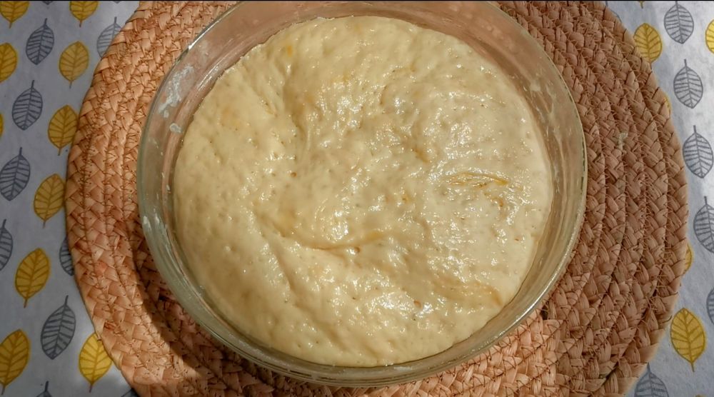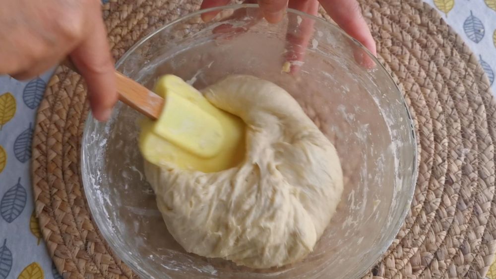 一、以上干粉原料混合,加入一个鸡蛋,用牛奶搅拌成软面团,覆盖松弛20分钟,加入20克软化黄油,用刮铲翻拌混合,覆盖放在家里温暖处,饧发至两倍大小