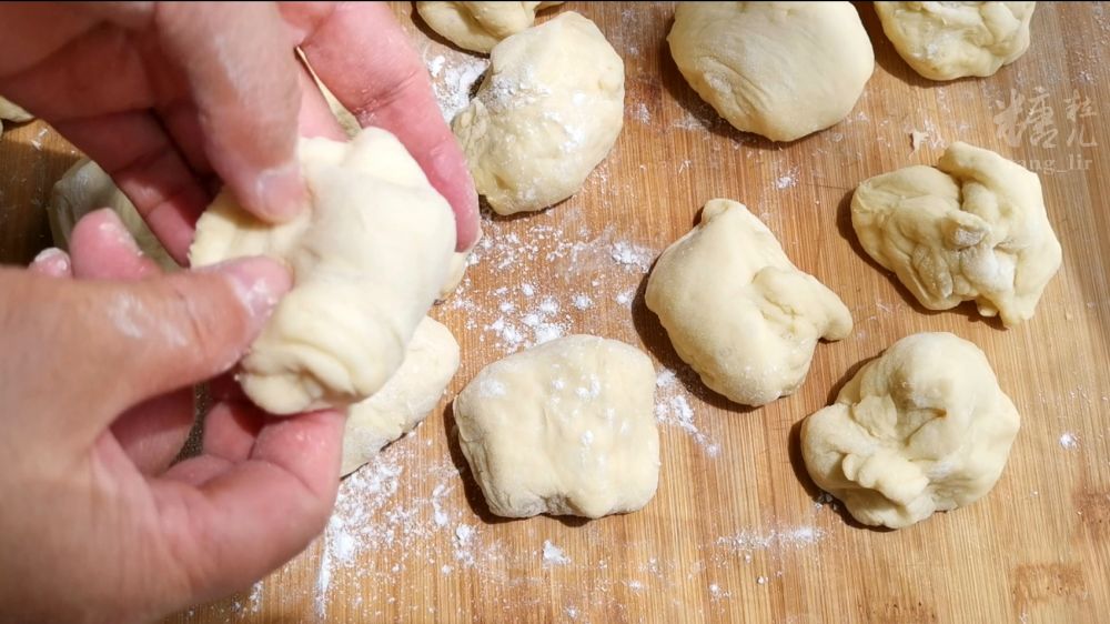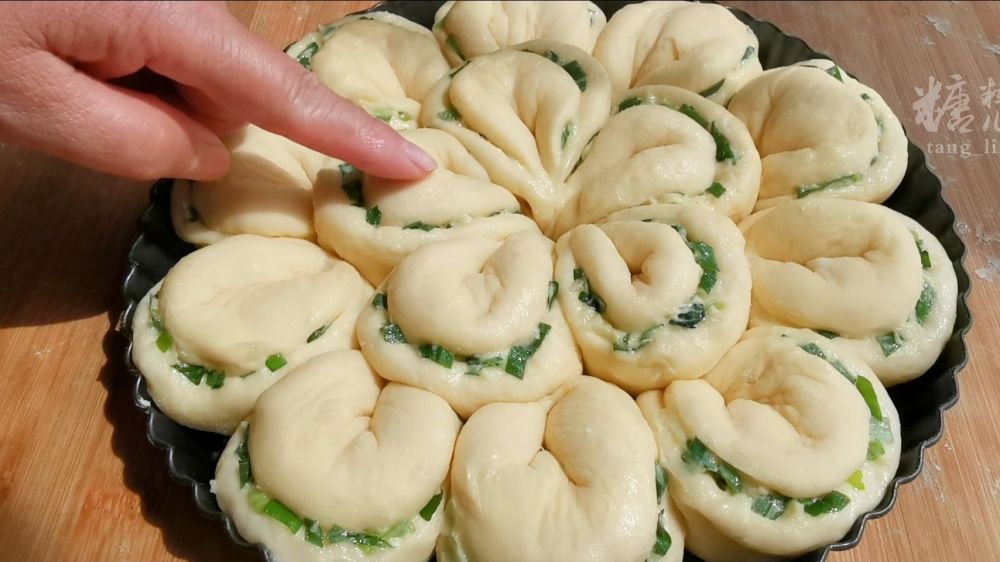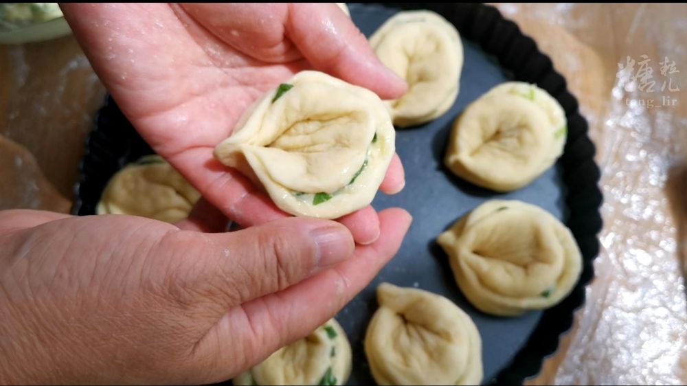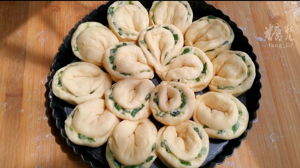 三、将醒发好的面团分成均等的15份,折叠做成15个圆形小面剂,涂抹半茶匙葱花黄油酱,简单整形后放入圆形烤盘,覆盖二次饧发20分钟,直到轻压迅速弹起