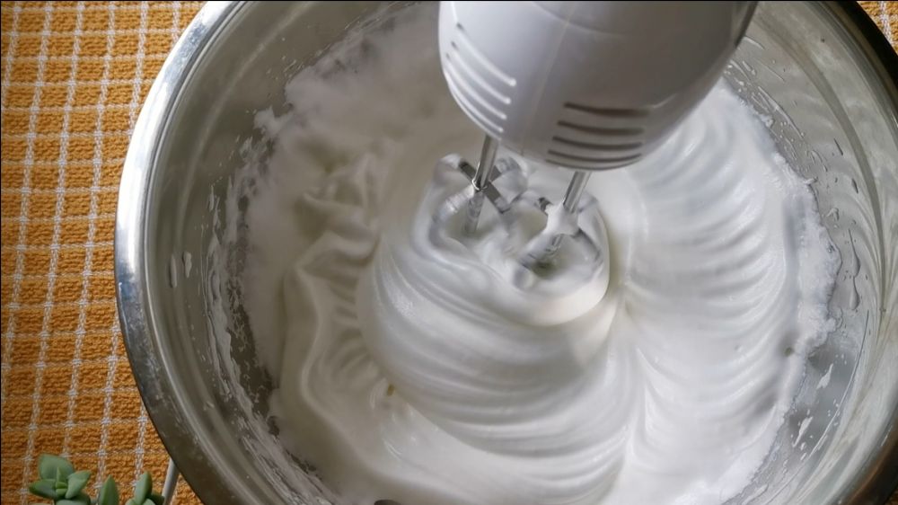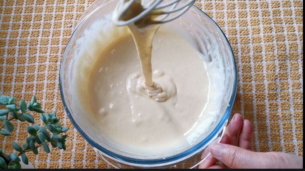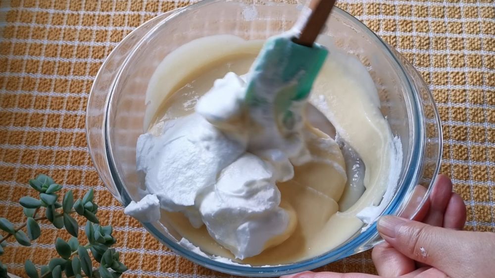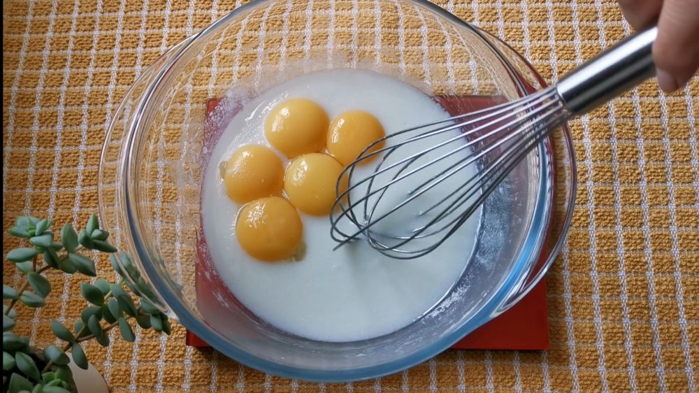 一、5个鸡蛋分离蛋清蛋黄,蛋清冷冻,蛋黄和食用油、牛奶、低筋粉混和搅拌成糊状