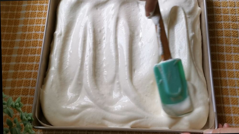 二、蛋清加柠檬汁或白醋以及白糖打发,与蛋黄糊混合均匀,倒入烤盘中抹平表面,撒上肉松