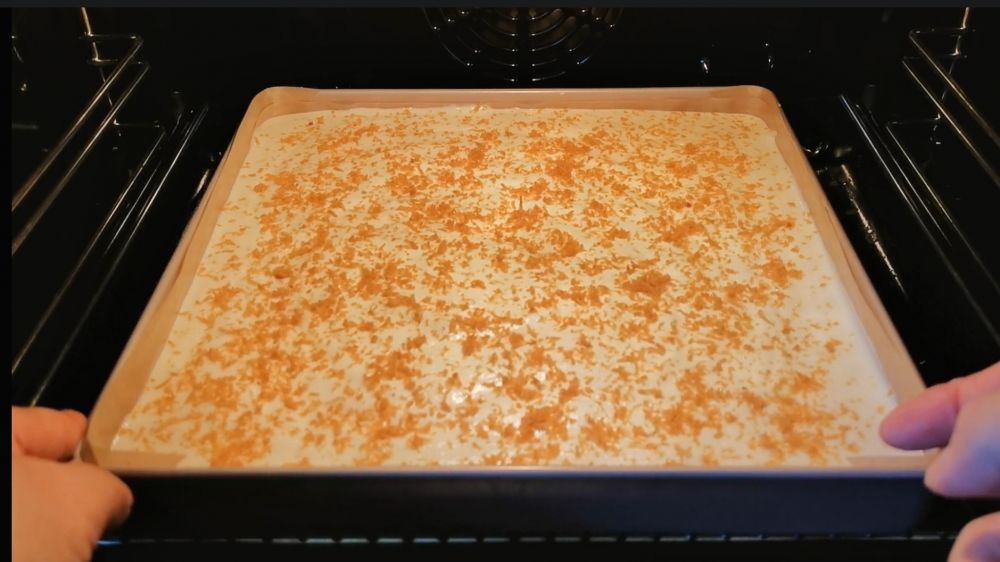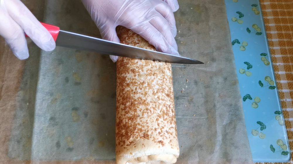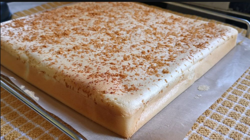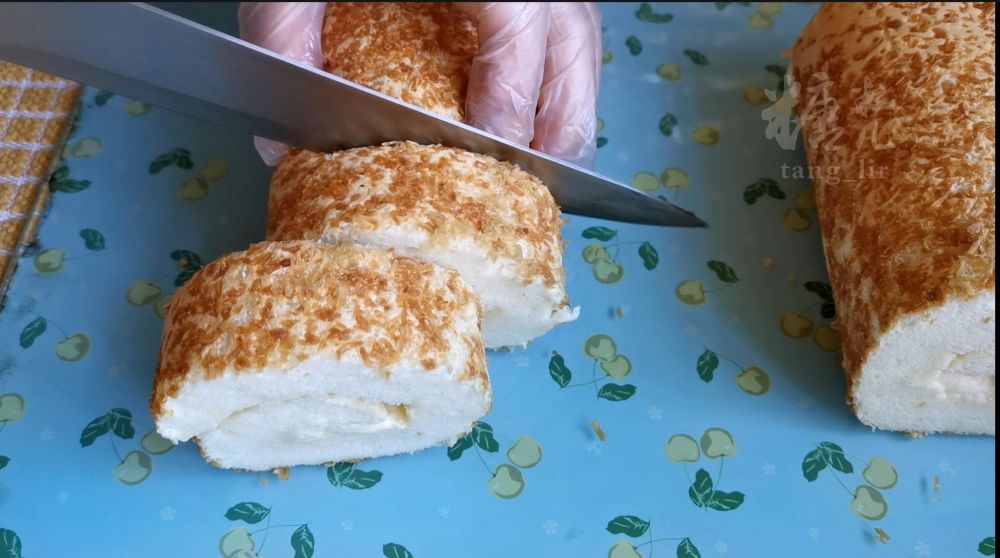 三、烤箱提前预热,140摄氏度烤30分钟,适当冷却后铺上打发的奶油,撒上一层肉松卷起,完全冷却后切片即食