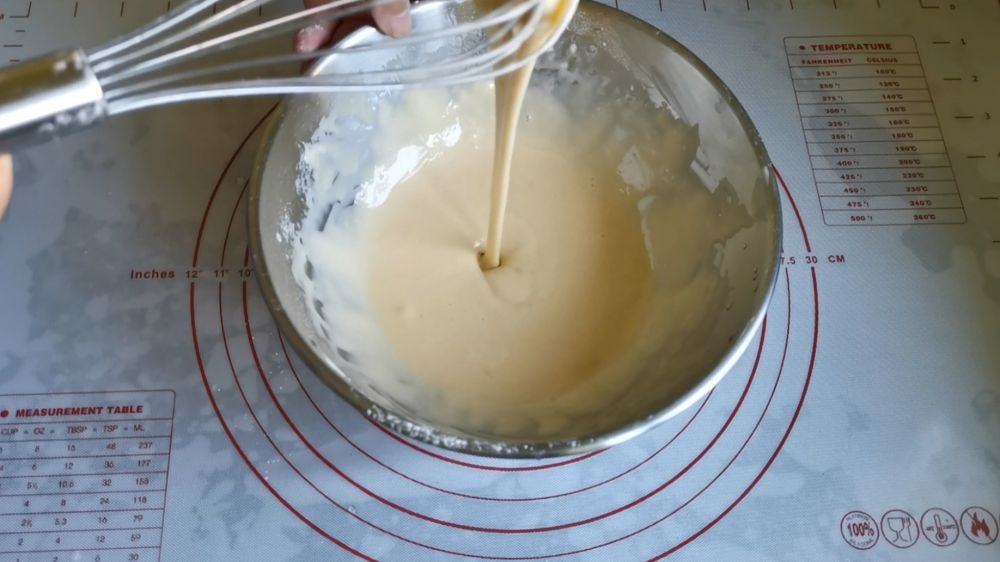 一、按照用料表先混合食用油、牛奶低筋面粉和五个蛋黄,冷冻过的蛋清中加入柠檬汁或者白醋1茶匙,打发到湿性发泡呈现大弯勾状,与蛋黄糊翻切拌混合均匀,从高处倒入烤盘中,抹平表面面,并用沙拉酱和椰蓉装饰表面