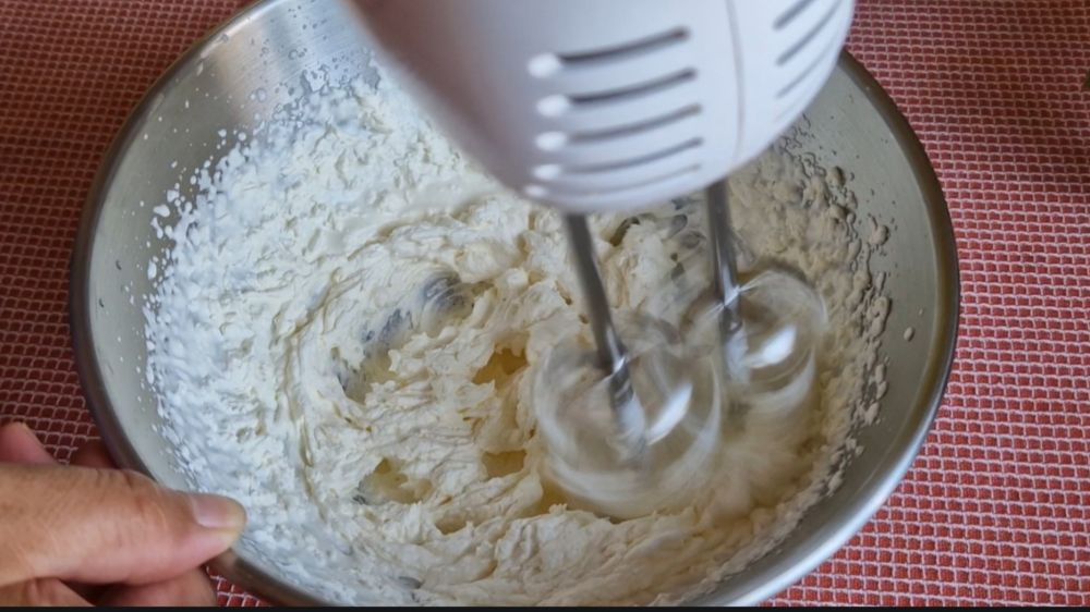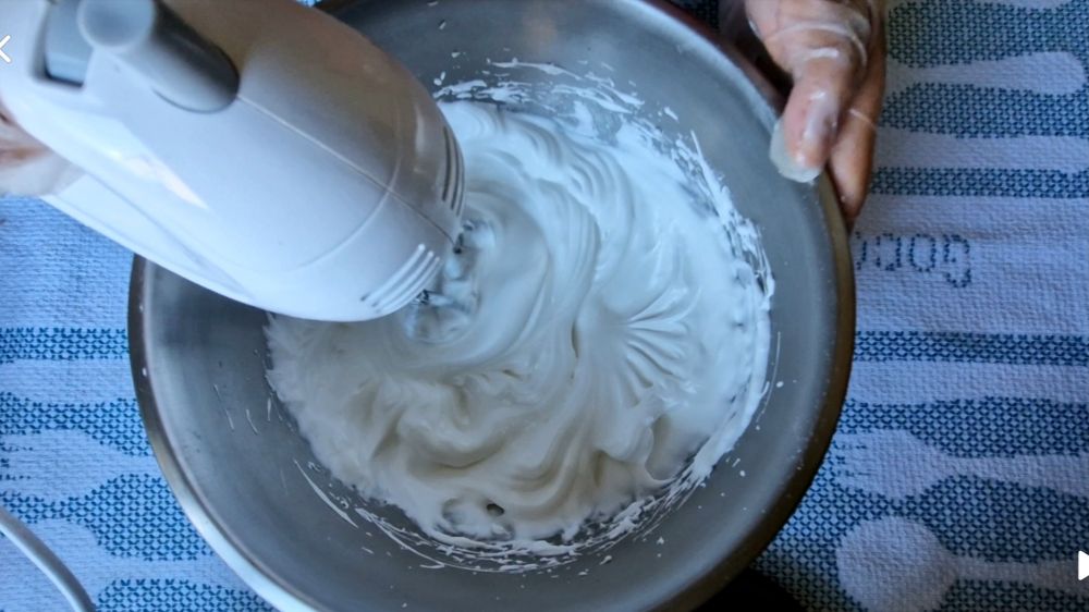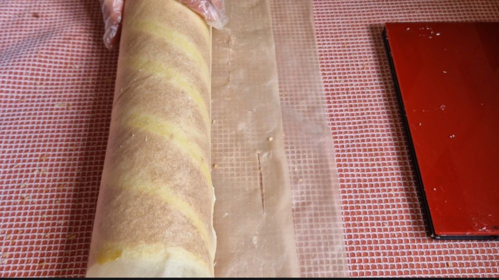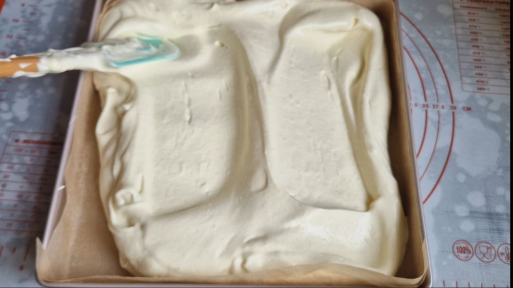 三、150克淡奶油加7~15克白糖打发到不流动,如视频涂抹,然后卷起来,用一根长尺帮助把蛋糕卷收紧,冷藏后会变得好切