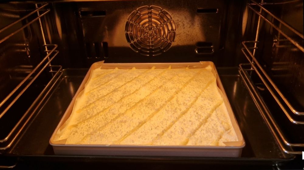 二、放入提前预热好的烤箱下层,130摄氏度上下火烤30分钟,在转150摄氏度上火烤3分钟让表面上色成金黄色,出炉后轻震脱模,自然冷却10分钟左右