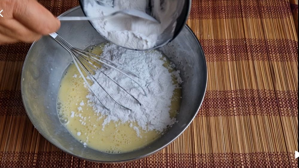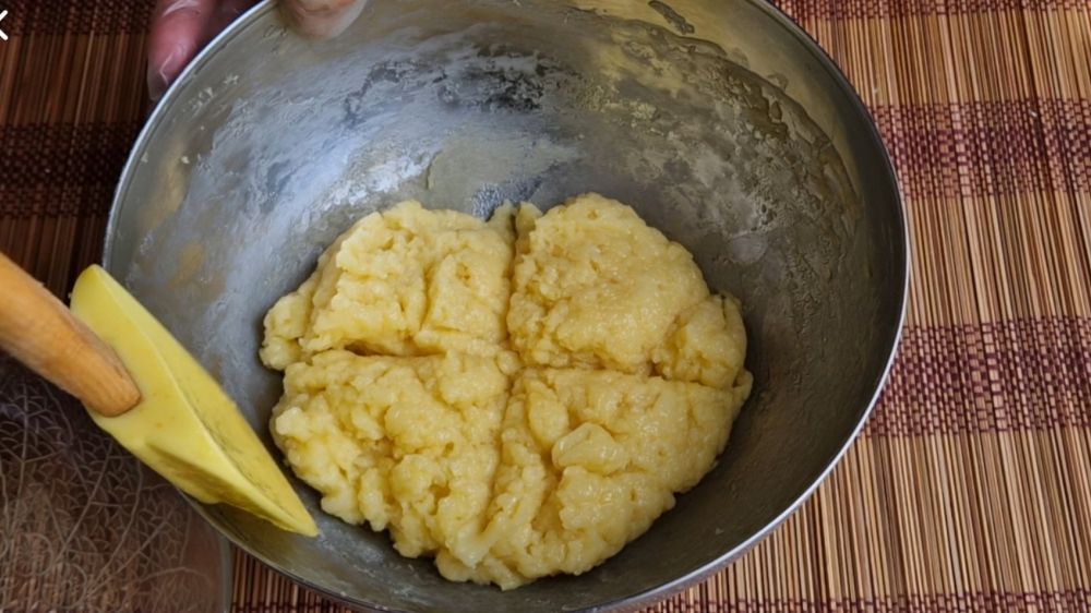 以上原料混合均匀,加入淀粉,搅拌到和蛋糊完全融合后过滤一下,最后加入融化无盐黄油,隔水加热不断搅拌,直到成团
