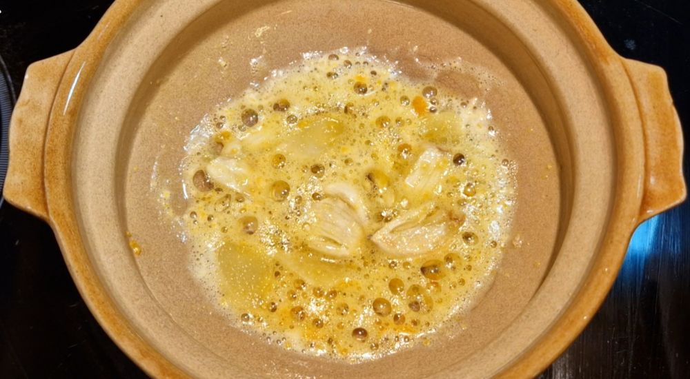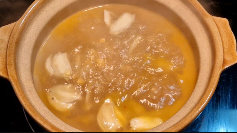 二、砂锅中放少许油,少热后先炝香配料,并把咸蛋黄碎超出红油,加入一茶匙蚝油和一碗热鸡汤煮开,下入苋菜煮软,加食盐调味,出锅前撒上葱花、白胡椒粉,再淋上几滴香油就可以热腾腾端上做桌享用了