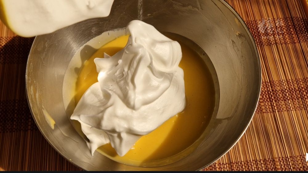 二、冷冻蛋清中加入1茶匙白醋和 淀粉,高速搅打成大弯钩状的蛋白霜,分两次与蛋黄糊混合成 原色蛋糊备用