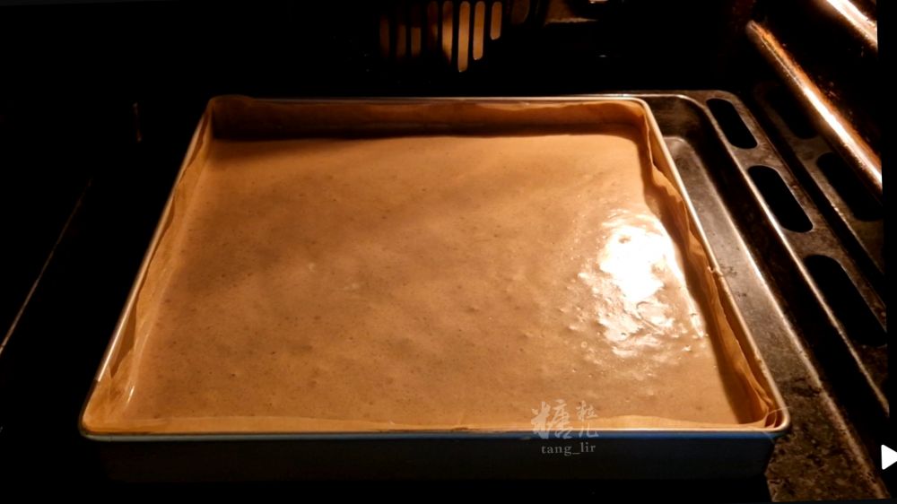 三、分别用可可粉,抹茶粉,和一点点黄色色素与原色蛋糊混合成绿色、深绿色、和黄色,在烘焙油布上临摹出郁金香图案,送入烤箱定型,可可液与原色蛋糊混合均匀,倒入烤盘,放入提前预热烤箱170摄氏度烤30分钟